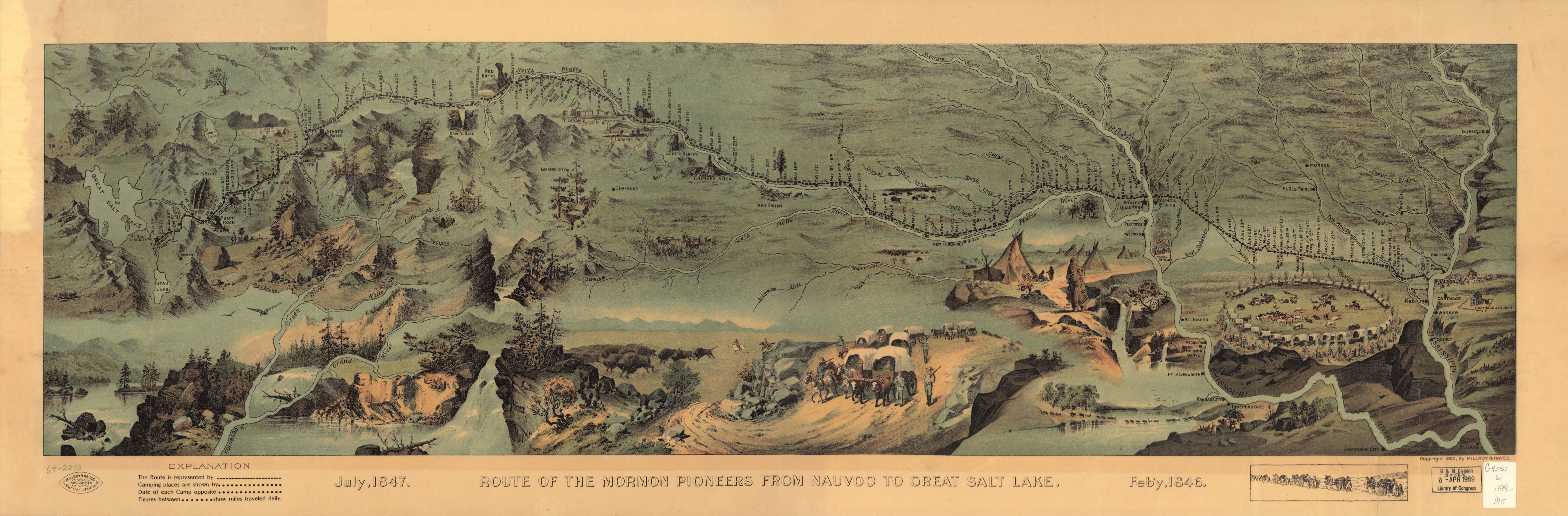 This colorful schematic map was printed in Denver for the New Wilson European Hotel in Salt Lake City in 1897, one year after Utah statehood, to commemorate the fifty-year anniversary of the Mormons’ arrival. The map is a chronological depiction of the Saints’ progress in 1847 across the Midwest and Plains, with miles traveled daily, and with vignettes showing a wagon train, a group of tepees, a buffalo herd, and numerous other scenes from the journey. The map includes place names, rivers, and mountains. Campsites along the route are noted with the dates on which the first emigrant party stayed at each site.