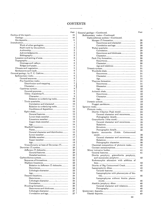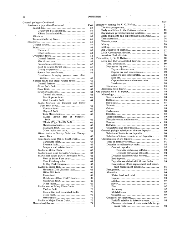 U.S. Geological Survey Professional Paper 201, "Geology and Ore Deposits of the Cottonwood-American Fork Area, Utah," by F.C. Calkins, B.S. Butler, and V.C. Heikes, provides an in-depth geological analysis of the region encompassing the historically significant Cottonwood and American Fork mining districts. This comprehensive study, originally published in 1948, meticulously documents the stratigraphy, structure, and mineralization of the area, focusing on the genesis and distribution of valuable ore deposits. Within these districts, detailed descriptions are provided for prominent mines such as the Cardiff, Emma, Silver King, and Michigan-Utah, among others. The report also documents extensive tunnel systems, including those driven into the mountainsides to access ore bodies, like those found in the vicinity of the Alta and Park City mining areas, though the latter is only mentioned in relation to the general regional geology and not a focus of the mine descriptions. The geographic features of Big Cottonwood Canyon, American Fork Canyon, and the surrounding peaks and drainages are thoroughly mapped and described, providing crucial context for understanding the spatial relationships between geological structures and ore deposits.