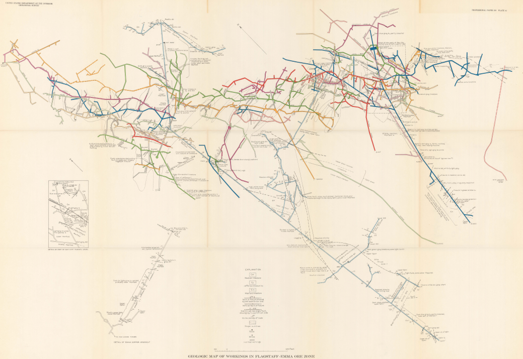 This 152-page report, accompanied by 51 figures and plates present contain geological maps, cross-sections, and mine workings diagrams, visually illustrating the complex geological relationships within the study area. These plates are essential for interpreting subsurface geology and ore deposit distribution. The text rigorously addresses the mineralogy and paragenesis of ores, identifying key economic minerals and associated gangue. Stratigraphic analyses cover formations from Precambrian to Tertiary, establishing a comprehensive geological history. The study also explores the structural controls on ore deposition, emphasizing the role of faulting and folding in localizing mineralization. The report details the mining districts within the area, focusing on the specific geology and ore deposits related to each. Mines such as the Columbus, Flagstaff, and others are mentioned, as well as the various mining tunnels that were crucial to accessing the ore bodies.