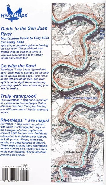 Discover the San Juan River with RiverMaps' "Guide to the San Juan River, Montezuma Creek to Clay Hills Crossing, Utah." Thanks to our intuitive "go-with-the-flow" design, this guide presents vital information in the order you'll encounter it downstream. No more flipping back and forth – effortlessly find the details you need as you float through Utah's stunning scenery.