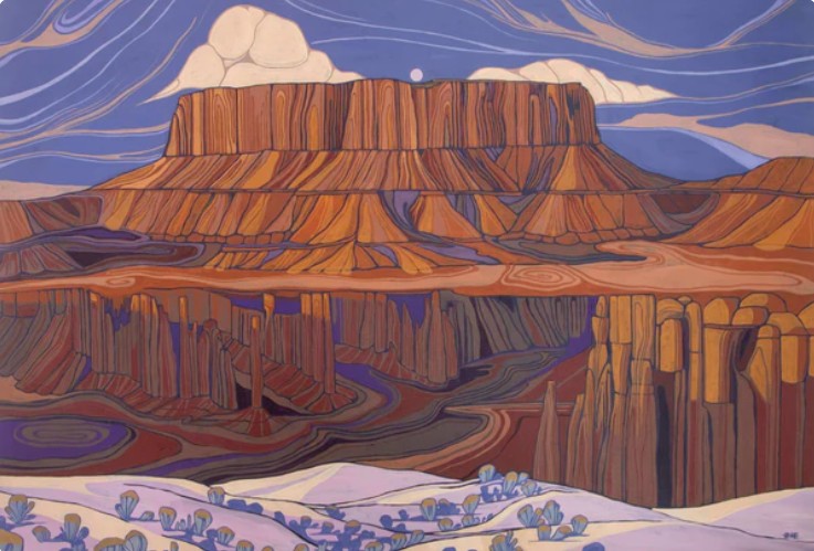 Artist and Salt Lake City native Lizzie Wenger's deep connection to the outdoors, forged through exploration and a passion for activities like climbing and hiking, translates into a visually striking and emotionally resonant portrayals of Utah's iconic landscapes and beyond. Her distinctive "psychedelic cubist" style, characterized by playful colors and inviting forms, offers a fresh and dynamic perspective on this iconic landscape, making her artwork truly special and remarkable in sharing the beauty of Utah and more.