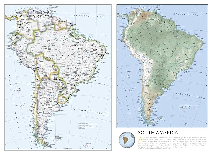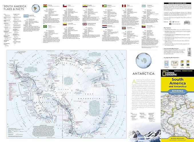 The National Geographic Reference Map "South America and Antarctica" is a thrilling guide to the diverse and awe-inspiring landscapes of these two continents. This map showcases the majestic Andes Mountains, the longest mountain range in the world, stretching along the western edge of South America. It also highlights the vast Amazon Rainforest, teeming with an incredible array of wildlife and plant species. The map beautifully illustrates the mighty Amazon River, winding its way through Brazil, Peru, and Colombia, and the stunning Iguazu Falls, one of the largest waterfall systems in the world. From the arid Atacama Desert in Chile to the lush Pantanal wetlands in Brazil, this map invites you to explore the wonders of South America.