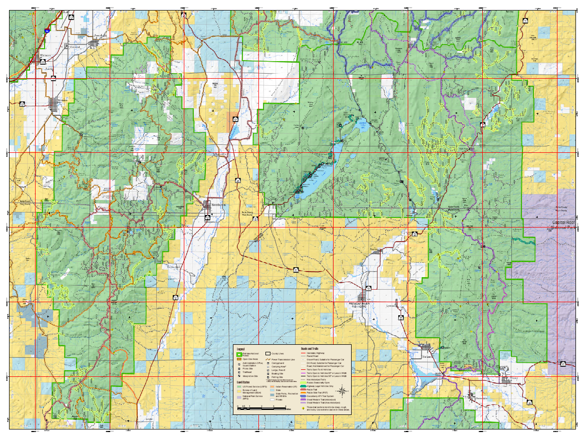 The Forest Service Travel Map is a colorized version of the Motor Vehicle Use Map (MVUM). The full-color maps show the travel routes in the Fishlake National Forest. These maps display all legal routes and areas open for motorized use and other useful information such as non-motorized routes, ownership, and topographic features. They are based on and can be used in conjunction with, the MVUM Maps (which show the legal designations of where you can travel with various motorized vehicles.)